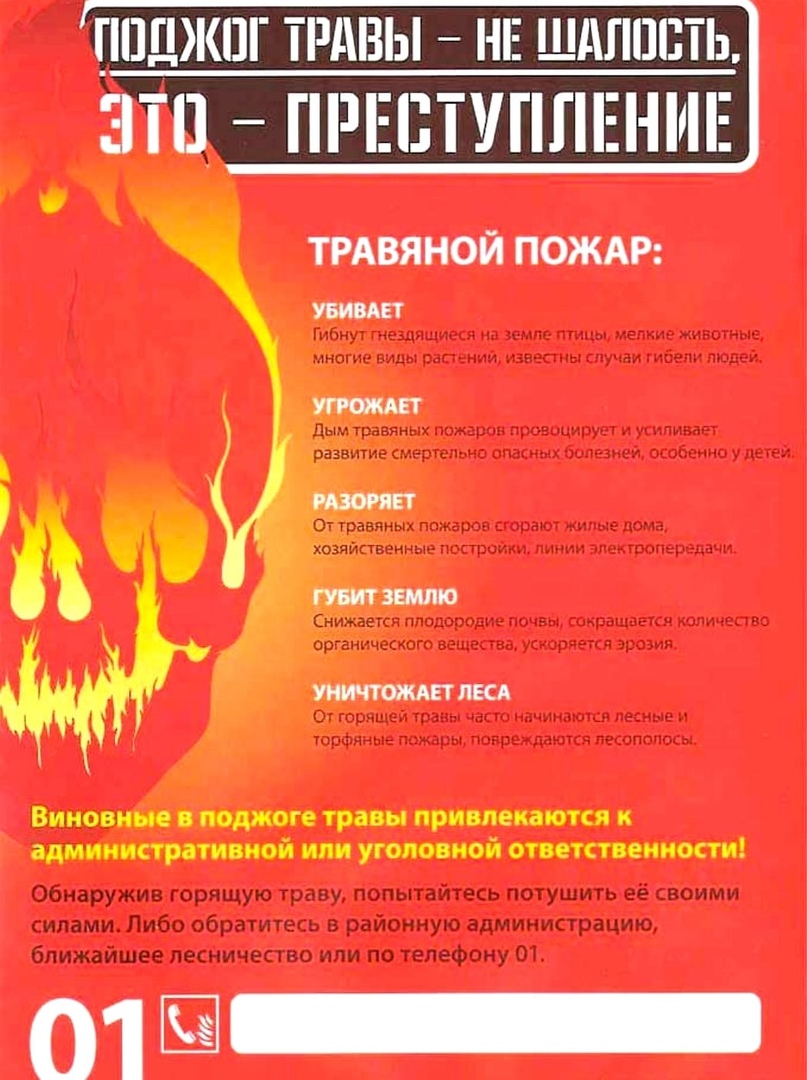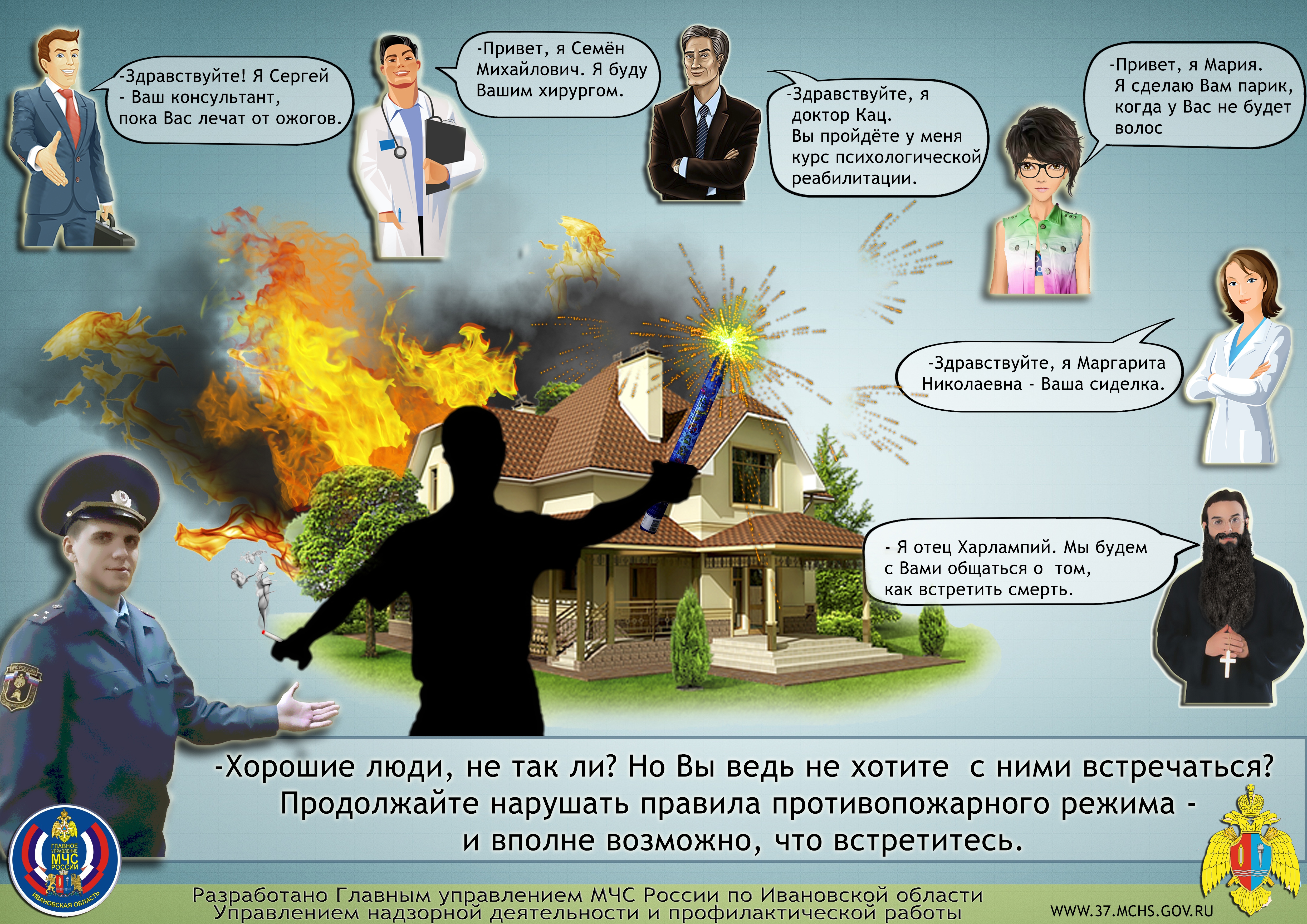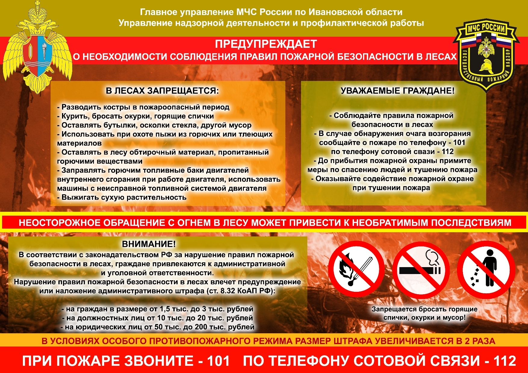 С 09 мая 2020 года на территории Ивановской области вводится особый противопожарный режим и режим повышенной готовности! В соответствии с Указом Губернатора Ивановской области от 08.05.2020 № 62-уг «О введении на территории Ивановской области особого противопожарного режима и режима повышенной готовности» с 09.05.2020 по 29.05.2020 на территории Ивановской области вводится особый противопожарный режим и режим повышенной готовности. В период действия особого противопожарного режима установлены следующие дополнительные требования пожарной безопасности: - Ограничить пребывание граждан в лесах Ивановской области и въезд в них транспортных средств; - Запретить разведение костров, проведение пожароопасных работ, работ с использованием открытого огня в лесах, на торфяниках и прилегающих к ним территориях. В соответствии с постановлением Правительства Российской Федерации от 25 апреля 2012 г. № 390 «О противопожарном режиме» в период действия особого противопожарного режима запрещено: - Выжигание сухой травянистой растительности, стерни, пожнивных остатков, разведение костров на полях; - На землях общего пользования населенных пунктов, дачных участков, частного жилого сектора, в местах отдыха разводить костры, а также сжигать мусор, траву, листву и иные отходы, материалы или изделия; - На территории поселений, городских округов и внутригородских муниципальных образований, а также на расстоянии менее 1000 метров от лесных массивов запускать неуправляемые изделия из горючих материалов, принцип подъема которых на высоту основан на нагревании воздуха внутри конструкции с помощью открытого огня. Собственники и арендаторы земельных участков обеспечивает очистку объекта защиты и прилегающей к нему территории, в том числе в пределах противопожарных расстояний между объектами защиты, от горючих отходов, мусора, тары и сухой растительности. Лица, виновные в нарушении правил пожарной безопасности, в зависимости от характера нарушений и их последствий, несут административную или уголовную ответственность. Напоминаем Вам, что административная ответственность виновных лиц в период действия особого противопожарного режима рассматривается по части 2 статьи 20.4 КоАП РФ, за что предусмотрено административное наказание в виде штрафа в размерах: на граждан 2000-4000 рублей, на должностных лиц 15000-30000 рублей, индивидуальных предпринимателей 30000-40000 рублей, юридических лиц 200000-400000 рублей. Уважаемые граждане! Будьте внимательны и осторожны при обращении с огнем, соблюдайте все правила пожарной безопасности. Берегите свои жизни от огня!